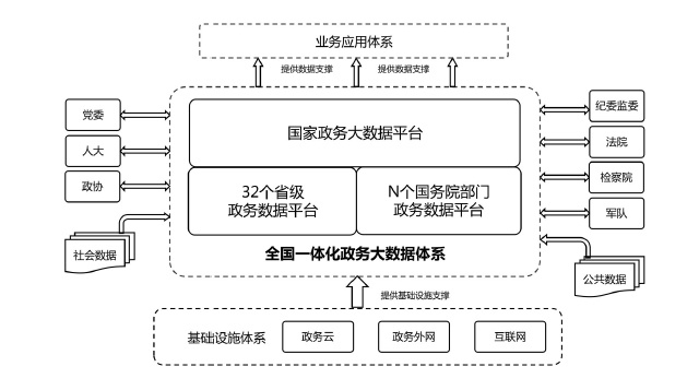 全國一體化政務大數(shù)據(jù)體系包括三類平臺和三大支撐。三類平臺為“1+32+N”框架結(jié)構(gòu)?!?”是指國家政務大數(shù)據(jù)平臺,是我國政務數(shù)據(jù)管理的總樞紐、政務數(shù)據(jù)流轉(zhuǎn)的總通道、政務數(shù)據(jù)服務的總門戶;“32”是指31個?。ㄗ灾螀^(qū)、直轄市)和新疆生產(chǎn)建設兵團統(tǒng)籌建設的省級政務數(shù)據(jù)平臺,負責本地區(qū)政務數(shù)據(jù)的目錄編制、供需對接、匯聚整合、共享開放,與國家平臺實現(xiàn)級聯(lián)對接;“N”是指國務院有關(guān)部門的政務數(shù)據(jù)平臺,負責本部門本行業(yè)數(shù)據(jù)匯聚整合與供需對接,與國家平臺實現(xiàn)互聯(lián)互通,尚未建設政務數(shù)據(jù)平臺的部門,可由國家平臺提供服務支撐。三大支撐包括管理機制、標準規(guī)范、安全保障三個方面。