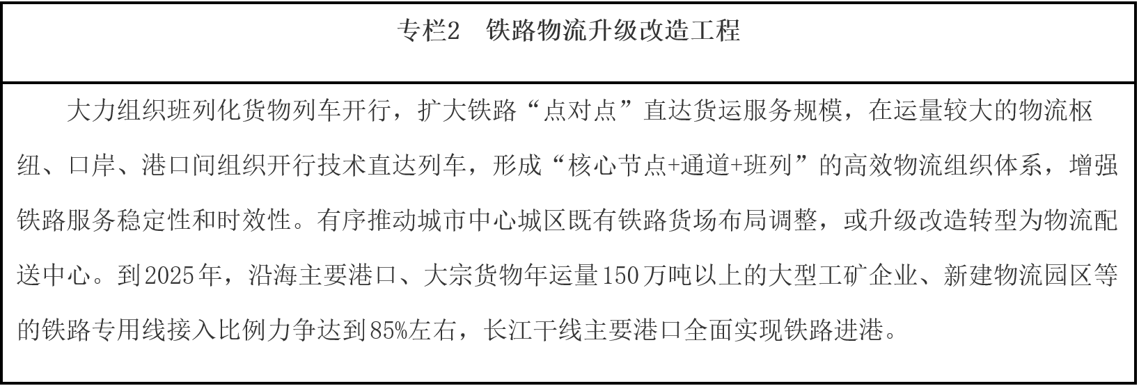 推進結構性降成本。加快推進鐵路專用線進港區(qū)、連園區(qū)、接廠區(qū),合理有序推進大宗商品等中長距離運輸“公轉鐵”、“公轉水”。完善集裝箱公鐵聯(lián)運銜接設施,鼓勵發(fā)展集拼集運、模塊化運輸、“散改集”等組織模式,發(fā)揮鐵路干線運輸成本低和公路網絡靈活優(yōu)勢,培育有競爭力的“門到門”公鐵聯(lián)運服務模式,降低公鐵聯(lián)運全程物流成本。統(tǒng)籌沿海港口綜合利用,提升大型港口基礎設施服務能力,提高碼頭現代化專業(yè)化規(guī)?;剑涌焱七M鐵水聯(lián)運銜接場站改造,提高港口鐵路專用線集疏網絡效能,優(yōu)化作業(yè)流程。完善內河水運網絡,統(tǒng)籌江海直達、江海聯(lián)運發(fā)展,發(fā)揮近海航線、長江水道、珠江水道等水運效能,穩(wěn)步推進貨物運輸“公轉水”。推進鐵水聯(lián)運業(yè)務單證電子化,促進鐵路、港口信息互聯(lián),實現鐵路現車、裝卸車、貨物在途、到達預確報以及港口裝卸、貨物堆存、船舶進出港、船期艙位預定等鐵水聯(lián)運信息交換共享。支持港口、鐵路場站加快完善集疏運油氣管網,有效對接石化等產業(yè)布局,提高管道運輸比例。