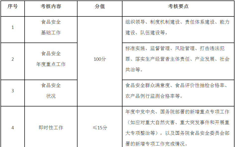 2.即時(shí)性工作由國務(wù)院食品安全辦根據(jù)工作有無及難易程度情況確定具體分值,在當(dāng)年考核方案及其細(xì)則中明確(相關(guān)成員單位擬納入即時(shí)性工作考核事項(xiàng),報(bào)國務(wù)院食品安全辦統(tǒng)籌)。