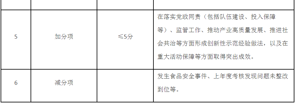 第五條 考核內(nèi)容主要包括食品安全基礎(chǔ)工作推進(jìn)、年度重點(diǎn)工作落實(shí)、食品安全狀況等,同時(shí)設(shè)置即時(shí)性工作評價(jià)和加減分項(xiàng)(考核內(nèi)容要點(diǎn)見附件)。具體考核指標(biāo)及分值在年度食品安全工作考核方案及其細(xì)則中明確,設(shè)置要科學(xué)合理,可操作、可評價(jià)、可區(qū)分,切實(shí)減輕基層負(fù)擔(dān)。