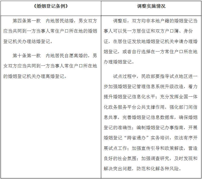 國務(wù)院決定在內(nèi)地居民婚姻登記“跨省通辦”試點地區(qū)暫時調(diào)整實施《婚姻登記條例》有關(guān)規(guī)定目錄