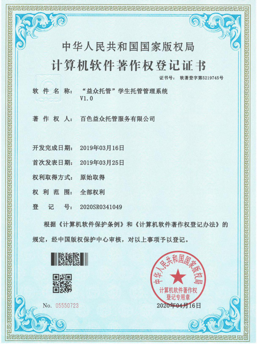 日前,經(jīng)中國版權(quán)保護(hù)中心審核,百色益眾托管服務(wù)有限公司提交的《“益眾托管”學(xué)生托管管理系統(tǒng)》符合《計算機(jī)軟件保護(hù)條例》和《計算機(jī)軟件著作權(quán)登記辦法》的相關(guān)規(guī)定,被認(rèn)定為原始取得,獲得國家版權(quán)局頒發(fā)《計算機(jī)軟件著作權(quán)登記證書》。