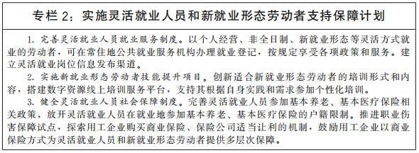 支持多渠道靈活就業(yè)和新就業(yè)形態(tài)發(fā)展。破除各種不合理限制,建立促進(jìn)多渠道靈活就業(yè)機(jī)制,支持和規(guī)范發(fā)展新就業(yè)形態(tài)。鼓勵(lì)傳統(tǒng)行業(yè)跨界融合、業(yè)態(tài)創(chuàng)新,增加靈活就業(yè)和新就業(yè)形態(tài)就業(yè)機(jī)會(huì)。加快落實(shí)《關(guān)于維護(hù)新就業(yè)形態(tài)勞動(dòng)者勞動(dòng)保障權(quán)益的指導(dǎo)意見》,建立完善適應(yīng)靈活就業(yè)和新就業(yè)形態(tài)的勞動(dòng)權(quán)益保障制度,引導(dǎo)支持靈活就業(yè)人員和新就業(yè)形態(tài)勞動(dòng)者參加社會(huì)保險(xiǎn),提高靈活就業(yè)人員和新就業(yè)形態(tài)勞動(dòng)者社會(huì)保障水平。規(guī)范平臺(tái)企業(yè)用工,明確平臺(tái)企業(yè)勞動(dòng)保護(hù)責(zé)任。健全職業(yè)分類動(dòng)態(tài)調(diào)整機(jī)制,持續(xù)開發(fā)新職業(yè),發(fā)布新職業(yè)標(biāo)準(zhǔn)。