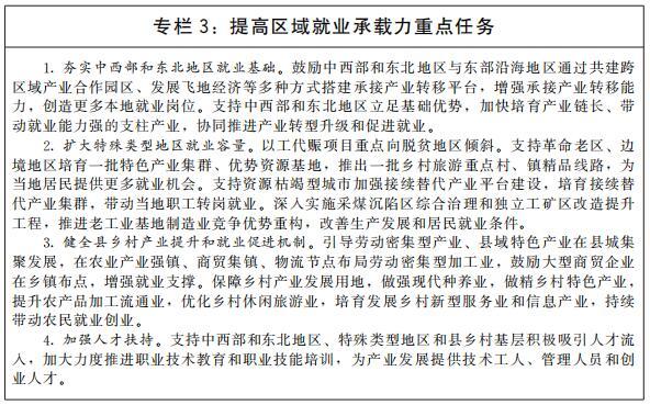 推動(dòng)區(qū)域就業(yè)協(xié)調(diào)發(fā)展。支持東部地區(qū)發(fā)揮創(chuàng)新要素集聚優(yōu)勢(shì),率先實(shí)現(xiàn)產(chǎn)業(yè)升級(jí),開拓高質(zhì)量就業(yè)新領(lǐng)域,培育高質(zhì)量就業(yè)增長(zhǎng)極。加快完善中西部和東北地區(qū)基礎(chǔ)設(shè)施,提升產(chǎn)業(yè)集聚區(qū)公共服務(wù)效能,引導(dǎo)產(chǎn)業(yè)向中西部和東北地區(qū)有序梯度轉(zhuǎn)移,推動(dòng)就業(yè)機(jī)會(huì)向中西部和東北地區(qū)擴(kuò)散。支持中西部和東北地區(qū)根據(jù)國家戰(zhàn)略導(dǎo)向和發(fā)展重點(diǎn),對(duì)接先進(jìn)生產(chǎn)要素和創(chuàng)新資源,發(fā)展特色優(yōu)勢(shì)產(chǎn)業(yè),改造提升傳統(tǒng)產(chǎn)業(yè),積極布局新興產(chǎn)業(yè),厚植就業(yè)創(chuàng)業(yè)沃土。