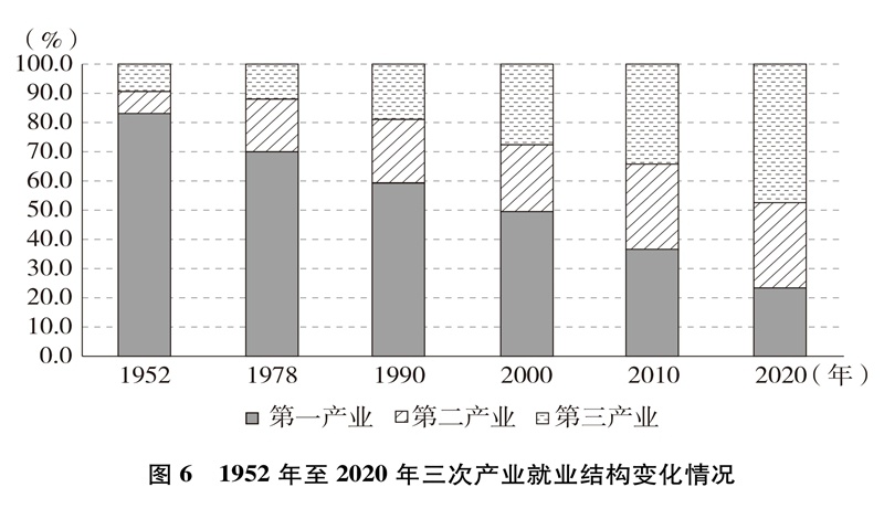產(chǎn)業(yè)結(jié)構(gòu)優(yōu)化升級(jí)。中國(guó)已建成世界上最完整的產(chǎn)業(yè)體系,產(chǎn)業(yè)發(fā)展持續(xù)向中高端邁進(jìn)。三次產(chǎn)業(yè)增加值之比從1952年的50.5∶20.8∶28.7到2020年的7.7∶37.8∶54.5,中國(guó)從傳統(tǒng)農(nóng)業(yè)大國(guó)成為工業(yè)大國(guó)、服務(wù)業(yè)大國(guó)(圖3),中國(guó)經(jīng)濟(jì)從依賴單一產(chǎn)業(yè)為主轉(zhuǎn)向依靠三次產(chǎn)業(yè)共同帶動(dòng)。農(nóng)業(yè)現(xiàn)代化成效顯著,機(jī)械化、數(shù)字化、綠色化、功能化、共享化水平明顯提高,廣大農(nóng)民逐步告別“面朝黃土背朝天、一身力氣百身汗”的辛勞,農(nóng)村生產(chǎn)力極大解放;糧食生產(chǎn)能力穩(wěn)步提升,實(shí)現(xiàn)谷物基本自給,中國(guó)人把飯碗牢牢端在自己手中。中國(guó)建成門(mén)類齊全、獨(dú)立完整的現(xiàn)代工業(yè)體系,工業(yè)化和信息化融合發(fā)展的廣度和深度不斷拓展,“中國(guó)制造”向“中國(guó)智造”轉(zhuǎn)型升級(jí),產(chǎn)業(yè)鏈供應(yīng)鏈現(xiàn)代化水平進(jìn)一步提升。以新一代信息技術(shù)、生物技術(shù)、高端裝備、綠色環(huán)保為代表的戰(zhàn)略性新興產(chǎn)業(yè)發(fā)展迅速,成為引領(lǐng)高質(zhì)量發(fā)展的重要引擎。數(shù)字經(jīng)濟(jì)激發(fā)經(jīng)濟(jì)發(fā)展新活力,產(chǎn)業(yè)數(shù)字化和數(shù)字產(chǎn)業(yè)化趨勢(shì)加快?,F(xiàn)代服務(wù)業(yè)加速發(fā)展,以“互聯(lián)網(wǎng)+”為標(biāo)志的新業(yè)態(tài)、新模式層出不窮,平臺(tái)經(jīng)濟(jì)、共享經(jīng)濟(jì)蓬勃興起,生產(chǎn)性服務(wù)業(yè)向?qū)I(yè)化和高端化發(fā)展,生活性服務(wù)業(yè)向精細(xì)化和高品質(zhì)轉(zhuǎn)變。產(chǎn)業(yè)結(jié)構(gòu)的優(yōu)化升級(jí)促進(jìn)了經(jīng)濟(jì)更加均衡、更加充分的發(fā)展,人們個(gè)性化品質(zhì)化多樣化需求不斷得到滿足。