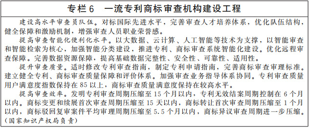 提高知識(shí)產(chǎn)權(quán)審查質(zhì)量和審查效率。完善適應(yīng)創(chuàng)新發(fā)展需求的知識(shí)產(chǎn)權(quán)審查管理體系,優(yōu)化專(zhuān)利、商標(biāo)審查協(xié)作機(jī)制。提升專(zhuān)利商標(biāo)審查機(jī)構(gòu)能力水平,強(qiáng)化專(zhuān)利、商標(biāo)、版權(quán)、地理標(biāo)志、植物新品種全流程審查質(zhì)量管控,提升知識(shí)產(chǎn)權(quán)授權(quán)確權(quán)質(zhì)量。提高專(zhuān)利、商標(biāo)審查業(yè)務(wù)精細(xì)化管理水平,優(yōu)化審查資源配置,加強(qiáng)智能化技術(shù)運(yùn)用,提升審查效能,縮短審查周期。完善專(zhuān)利、商標(biāo)審查模式,加強(qiáng)審查與產(chǎn)業(yè)發(fā)展的政策協(xié)同和業(yè)務(wù)聯(lián)動(dòng),滿足產(chǎn)業(yè)綠色轉(zhuǎn)型和新領(lǐng)域新業(yè)態(tài)創(chuàng)新發(fā)展等社會(huì)多樣化需求。(中央宣傳部、工業(yè)和信息化部、農(nóng)業(yè)農(nóng)村部、國(guó)家林草局、國(guó)家知識(shí)產(chǎn)權(quán)局等按職責(zé)分工負(fù)責(zé))
