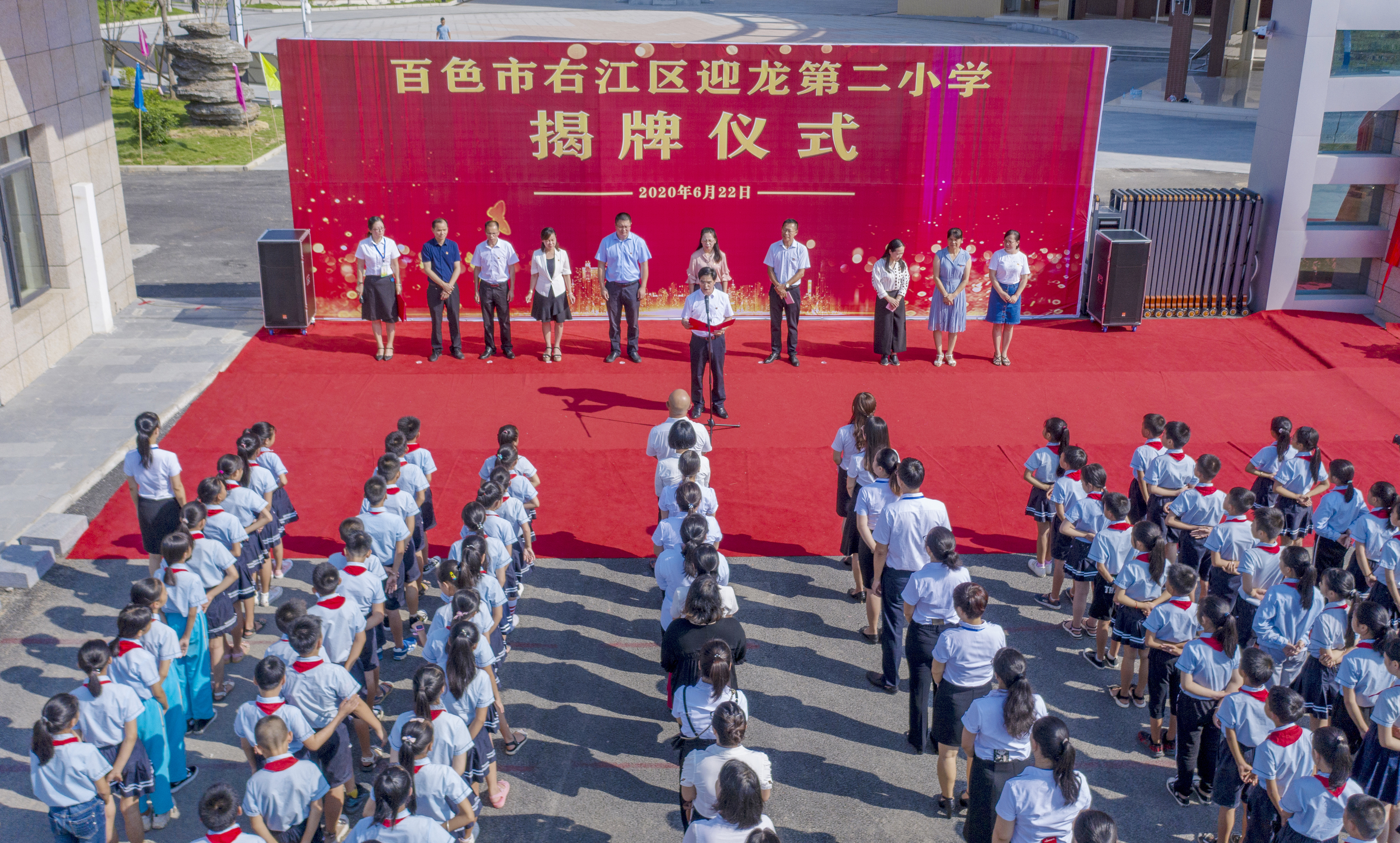 ????6月22日上午,百色市右江區(qū)迎龍第二小學(xué)揭牌儀式在該校大門(mén)舉行,標(biāo)志著這所由廣西百色益眾投資有限公司承建的小學(xué)全面交付使用。