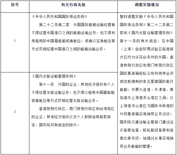 一、按照《中國(上海)自由貿(mào)易試驗區(qū)臨港新片區(qū)總體方案》,同意自即日起至2024年12月31日,在中國(上海)自由貿(mào)易試驗區(qū)臨港新片區(qū)暫時調(diào)整實施《中華人民共和國國際海運條例》《國內(nèi)水路運輸管理條例》的有關規(guī)定(目錄附后)。