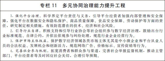 (三)完善多元共治新格局。建立完善政府、平臺(tái)、企業(yè)、行業(yè)組織和社會(huì)公眾多元參與、有效協(xié)同的數(shù)字經(jīng)濟(jì)治理新格局,形成治理合力,鼓勵(lì)良性競爭,維護(hù)公平有效市場。加快健全市場準(zhǔn)入制度、公平競爭審查機(jī)制,完善數(shù)字經(jīng)濟(jì)公平競爭監(jiān)管制度,預(yù)防和制止濫用行政權(quán)力排除限制競爭。進(jìn)一步明確平臺(tái)企業(yè)主體責(zé)任和義務(wù),推進(jìn)行業(yè)服務(wù)標(biāo)準(zhǔn)建設(shè)和行業(yè)自律,保護(hù)平臺(tái)從業(yè)人員和消費(fèi)者合法權(quán)益。開展社會(huì)監(jiān)督、媒體監(jiān)督、公眾監(jiān)督,培育多元治理、協(xié)調(diào)發(fā)展新生態(tài)。鼓勵(lì)建立爭議在線解決機(jī)制和渠道,制定并公示爭議解決規(guī)則。引導(dǎo)社會(huì)各界積極參與推動(dòng)數(shù)字經(jīng)濟(jì)治理,加強(qiáng)和改進(jìn)反壟斷執(zhí)法,暢通多元主體訴求表達(dá)、權(quán)益保障渠道,及時(shí)化解矛盾糾紛,維護(hù)公眾利益和社會(huì)穩(wěn)定。