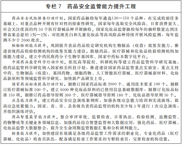 完善藥品安全監(jiān)管制度。加強藥物臨床試驗核查,嚴格執(zhí)行藥品、醫(yī)療器械、化妝品等生產(chǎn)質量管理規(guī)范,對重點生產(chǎn)企業(yè)開展全覆蓋檢查。開展藥品質量提升行動,健全生物制品等高風險產(chǎn)品標準制定工作機制,提高藥品、醫(yī)療器械、化妝品標準。改革和完善疫苗監(jiān)管體制機制,提高省級藥品檢驗檢測機構對轄區(qū)內生產(chǎn)的主要疫苗品種批簽發(fā)能力。深入開展無菌植入性醫(yī)療器械監(jiān)督檢查、化妝品“線上凈網(wǎng)、線下清源”等專項整治行動,切實規(guī)范藥品、醫(yī)療器械、化妝品市場秩序。
