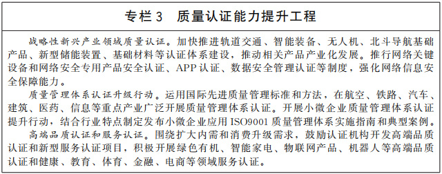 提高質量認證服務能力。加快構建統(tǒng)一管理、共同實施、權威公信、通用互認的質量認證體系,全面提升質量認證服務能力,打造一批具有國際競爭力的認證品牌。推動完善重點產(chǎn)業(yè)質量認證制度體系,加大網(wǎng)絡安全認證制度推行力度,加快戰(zhàn)略性新興產(chǎn)業(yè)領域質量認證制度建設,大力推行高端品質認證和新型服務認證,加快研究和完善國家數(shù)據(jù)安全標準與認證認可體系。廣泛開展質量管理體系認證升級行動。健全政府、行業(yè)、社會等多層面的認證采信機制,推動在市場采購、行業(yè)管理、行政監(jiān)管、社會治理等領域廣泛采信認證結果。提升認證行業(yè)專業(yè)化集約化水平,優(yōu)化行業(yè)布局結構,推動認證行業(yè)數(shù)字化發(fā)展。