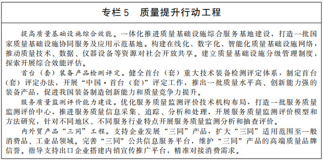 完善質量管理制度。建立健全質量統(tǒng)計監(jiān)測體系,開展高質量發(fā)展綜合績效評價,完善質量安全與質量發(fā)展監(jiān)測指標。完善質量激勵政策,開展中國質量獎評選表彰活動,建立政府質量獎獲獎企業(yè)和個人先進質量管理經(jīng)驗宣傳推廣機制,引導各行業(yè)加強全面質量管理。完善質量提升資金多元籌集和保障機制,加強對質量創(chuàng)新和質量提升的支持。