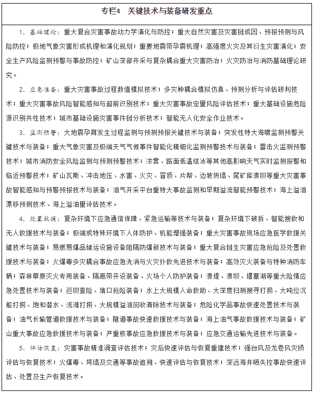 深化應(yīng)用基礎(chǔ)研究。聚焦災(zāi)害事故防控基礎(chǔ)問題,強化多學(xué)科交叉理論研究。開展重大自然災(zāi)害科學(xué)考察與調(diào)查。整合利用中央和地方政府、企業(yè)以及其他優(yōu)勢科技資源,加強自主創(chuàng)新和“卡脖子”技術(shù)攻關(guān)。實施重大災(zāi)害事故防治、重大基礎(chǔ)設(shè)施防災(zāi)風(fēng)險評估等國家科技計劃項目,制定國家重大應(yīng)急關(guān)鍵技術(shù)攻關(guān)指南,加快主動預(yù)防型安全技術(shù)研究。